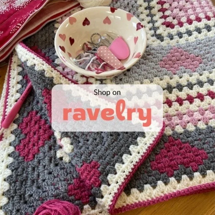 Pretty hearts and soft stripes in this simple, beginner friendly granny square blanket.