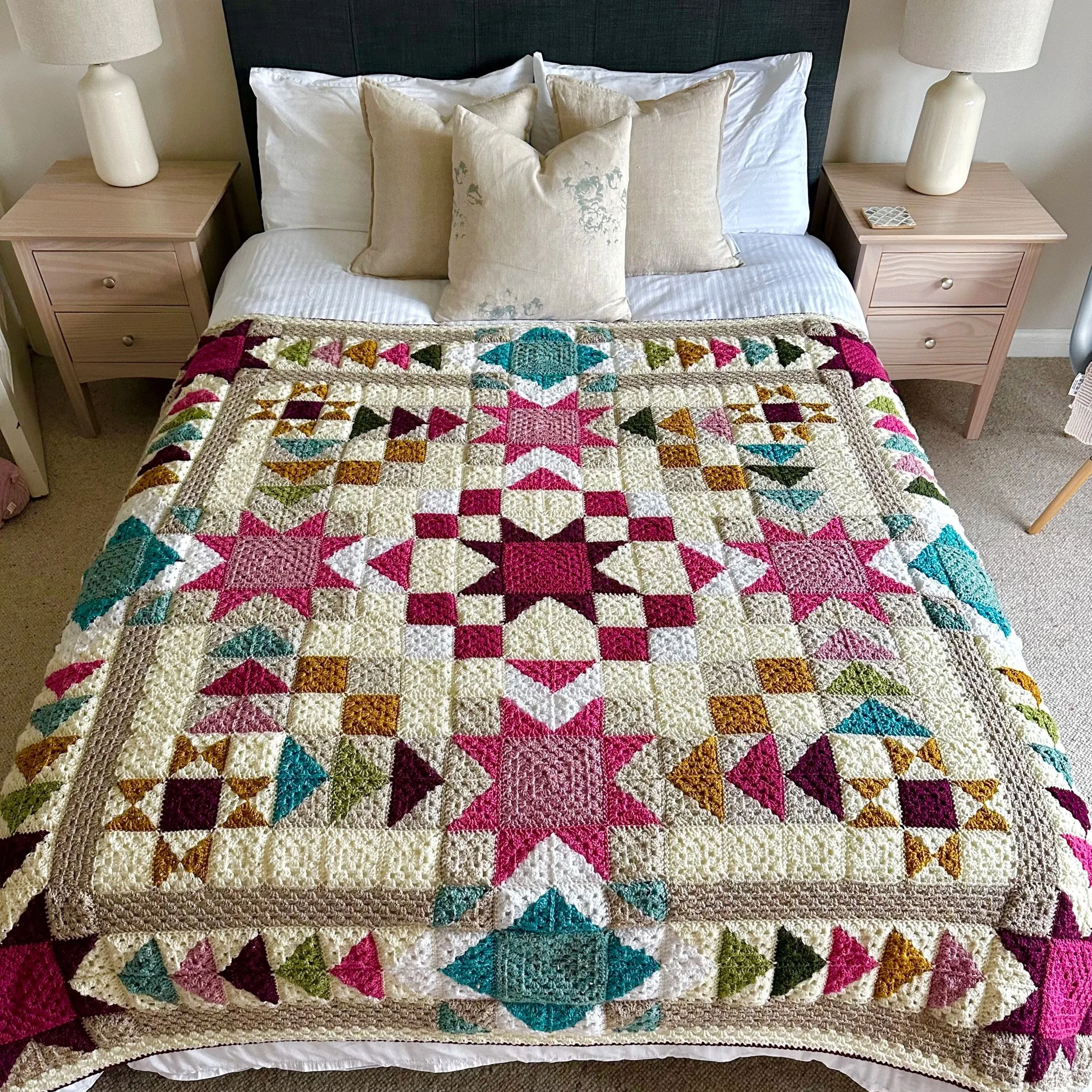 A patchwork quilt-inspired blanket made from soft rustic toned crochet blocks.