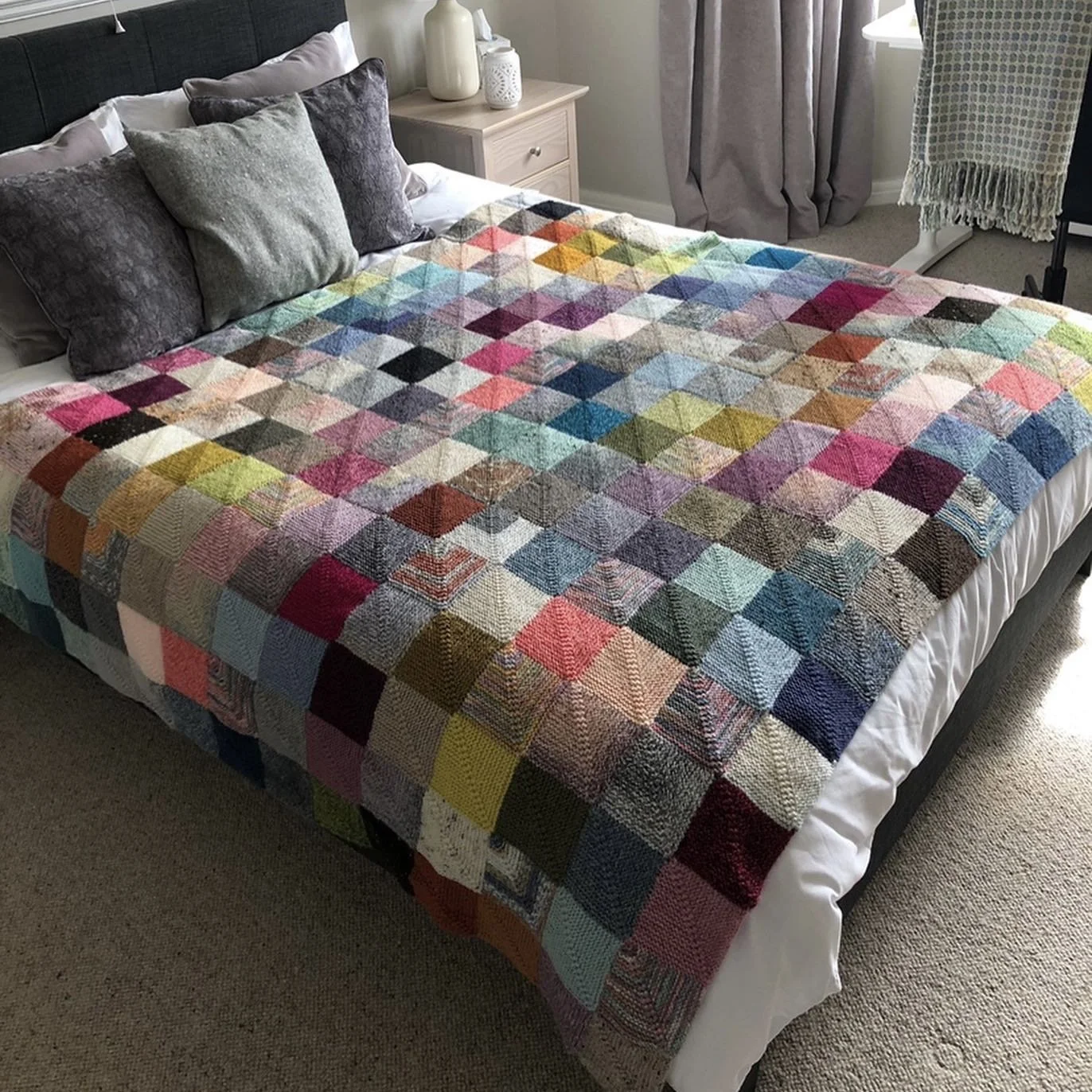 This is my largest knitted mitred squares blanket to date. It was an absolute joy to make, but it took forever.