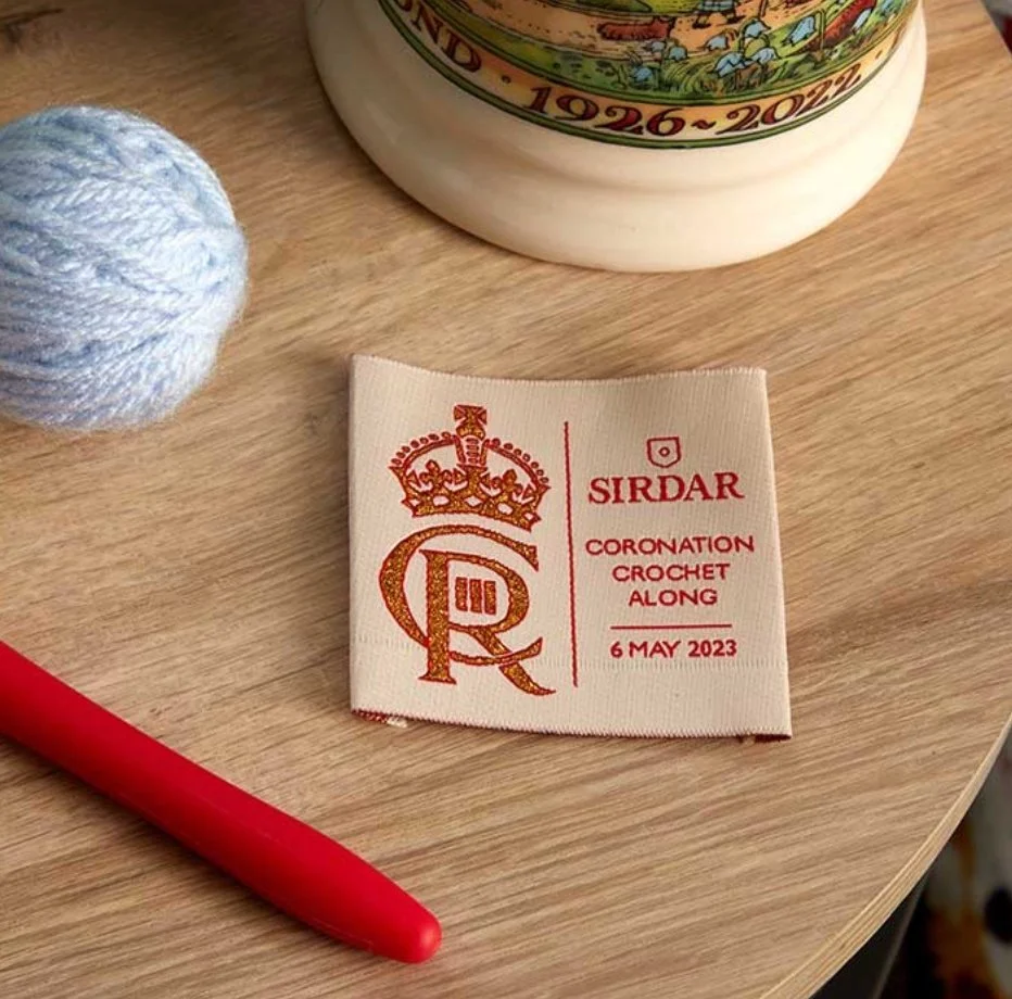 The final touch is the keepsake label. I wanted to include the King’s cypher on the blanket. I tried lots of different ways to add it, but it’s very difficult to add that level of detail in crochet. The inspiration for the woven label came from traditional British blankets. I remember having Witney blankets as a child and their woven labels seem so traditional and appropriate. Luckily Sirdar agreed and designed the amazing label. The Cypher is embroidered in gold thread and it really sparkles.