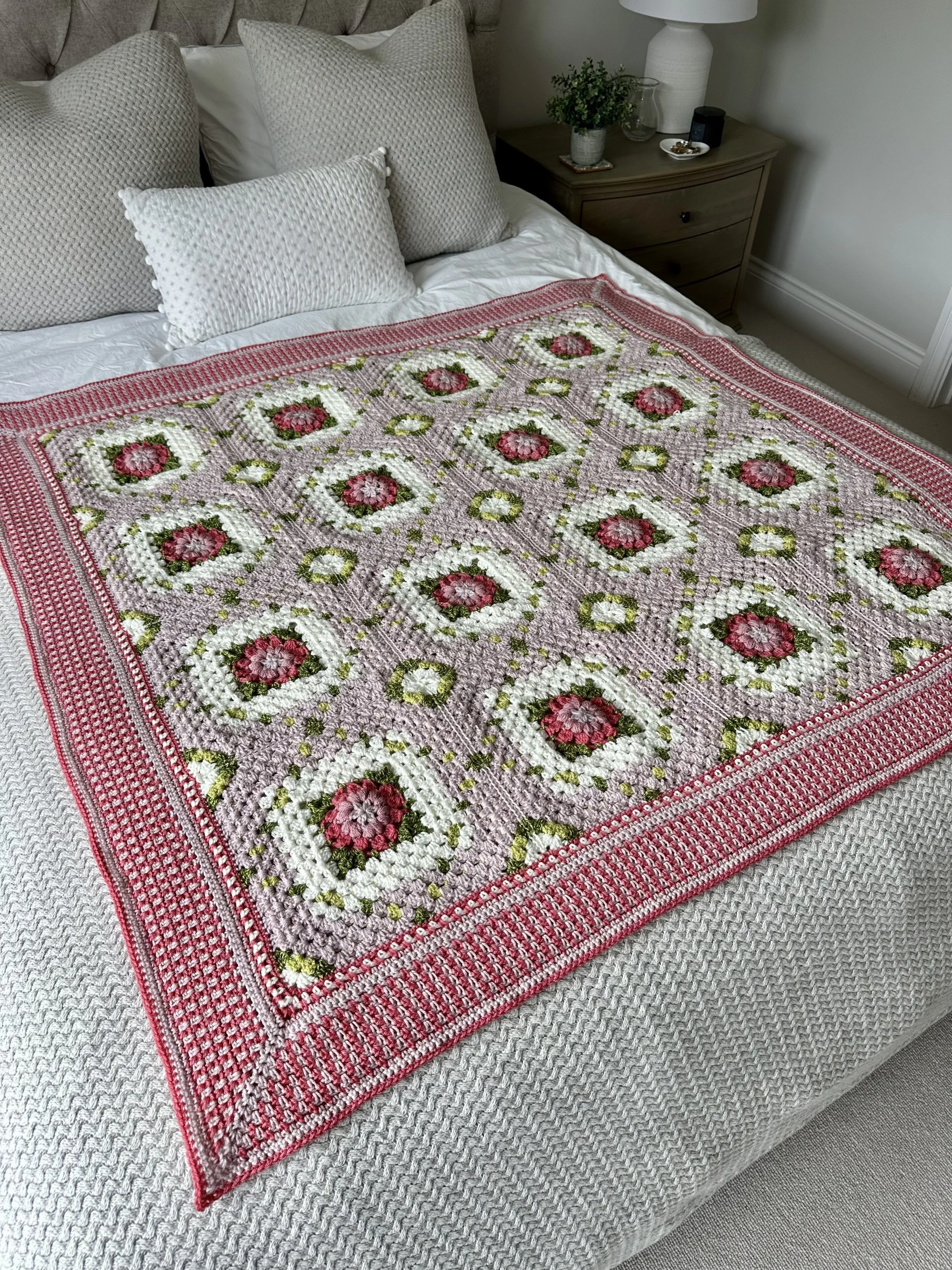 The Trellis Blanket Pink Edition is a fresh new version with a distinctly vintage feel. It reminds me of fading summer roses with their soft petals and bright glossy leaves.